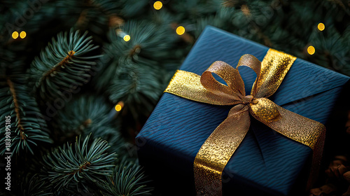 Dark Blue Gift Box with Metallic Golden Ribbon Surrounded by Festive Decor on Transparent Background