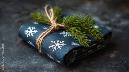 Dark blue napkin with snowflake print, adorned with twine and a sprig of pine for a rustic, festive holiday table setting; ideal for winter-themed decor.
