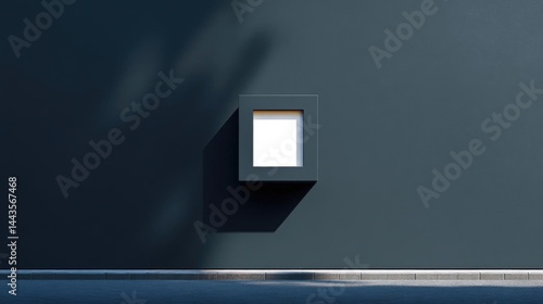 Dark blue wall with a small square window in the center. the window is rectangular in shape and has a white frame.