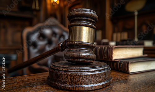 Dark Brown Wooden Gavel on Rich Wooden Desk with Old Law Books