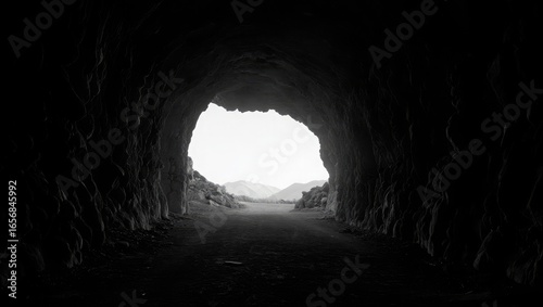 Dark Cave Entrance Opening to Bright Landscape tunnel