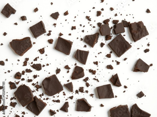 dark chocolate crumbs scattered on a white background with pieces of air floating above them, whimsical atmosphere, chocolate fragments