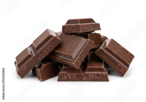 Dark chocolate pieces pile isolated on white background