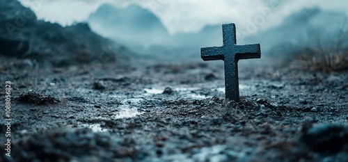 Dark cross planted in barren, wet ground.