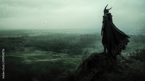Dark figure overlooking misty landscape at twilight