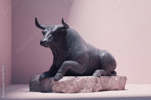 Dark gray bull sculpture resting on a stone pedestal.