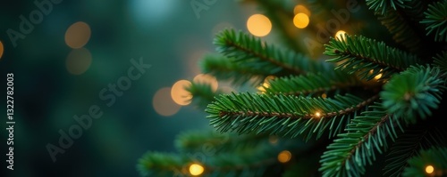 Dark green pine, bright twinkling lights, holiday mood , magical, bright, winter