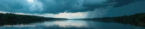 Dark grey clouds above a river with ripples on the water, reflection, thunderstorm