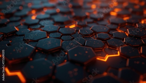 Dark hexagonal grid with glowing orange lines emanates futuristic tech feel. Abstract pattern depth, creating sense of advanced digital space. Seamlessly textured surface suitable for science
