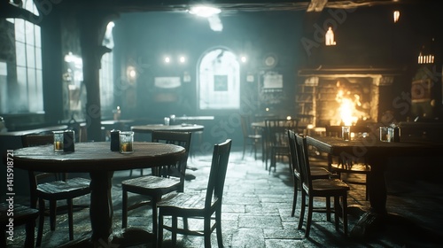 Dark Medieval Tavern Interior Scene Cozy Rustic Wooden Tables Chairs Fireplace Atmospheric Lighting Game Background Fantasy Setting Vintage Old World