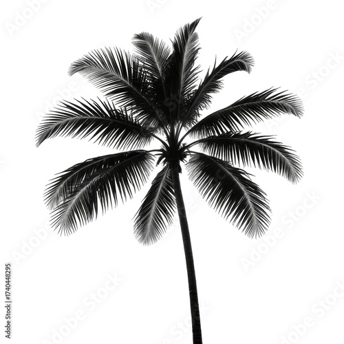 Dark monochrome palm tree silhouette with detailed leaf textures, isolated on black background