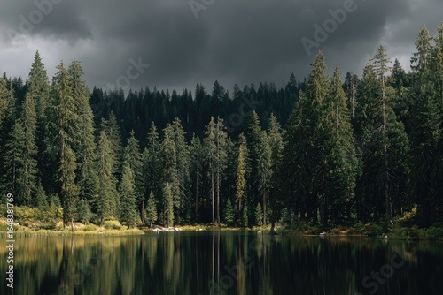 Dark, moody forest lake scene