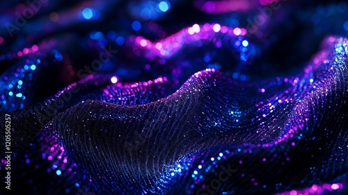Dark purple background with shiny sequins and bokeh lights. Black, pink, and blue colors. Wide banner for fashion design