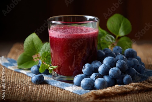 Dark red juice sits next to a pile of fresh blueberries on a linen cloth