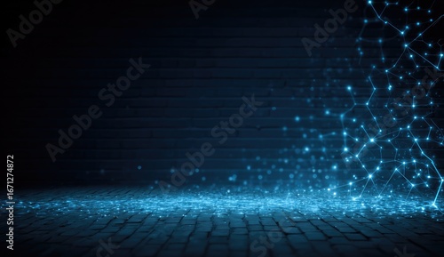 Dark room, glowing blue network on brick floor
