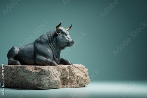 Dark, sculpted bull statue resting on a stone pedestal.