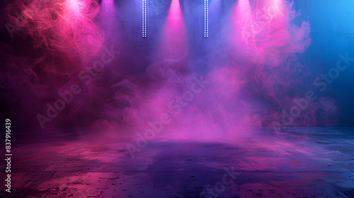 Dark Stage with Neon Lights and Smoke for Product Display