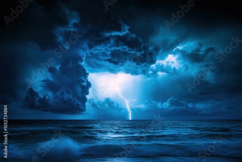Dark Storm Clouds Over a Rough Ocean with Lightning Strike