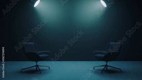 Dark studio room with two chairs positioned for an interview, subtle spotlight illumination with blank background space, ideal for podcast branding.
