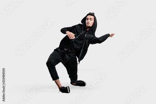 Dark-haired stylish dancer wearing black clothes and a hood makes stylized movements of street dance.