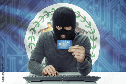 Dark-skinned hacker with flag on background holding credit card - Belize