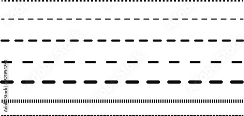Dashed Line Styles – Set of 7 Stroke Variations Showcasing Different Dash Lengths and Gaps for Technical, UI, and Decorative Applications