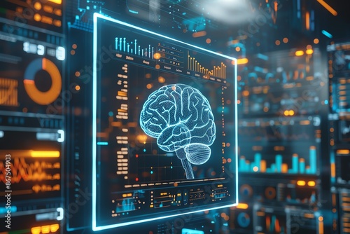 Data analysis, double exposure brain and graphs, holographic insights, dark tech background