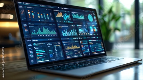 Data analysis on laptop screen, modern office background. Use website, presentation