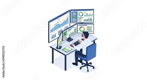 Data Analyst Working with Charts and Graphs on Multiple Screens.