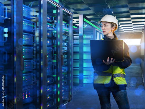 Data center engineer inspects server racks with laptop, ensuring network security, maintenance, and reliable IT infrastructure management.