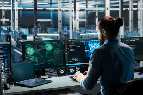 Data center engineer using AI assistant to manage global server infrastructure with international networks. Admin using artificial intelligence LLM to monitor worldwide system operations