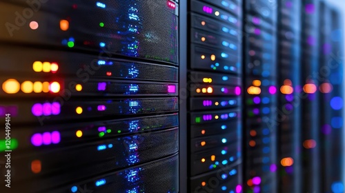 Data center servers glowing, network infrastructure, digital technology, background blurred lights, for tech websites