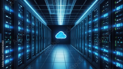 Data center with a glowing cloud icon, representing cloud-based backup and recovery after cyberattacks. Ideal for illustrating data security and disaster recovery.