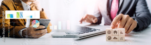 Data Management System with Business Analytics concept. business team hands working with provide information for Key Performance Indicators and marketing analysis onn virtual computer