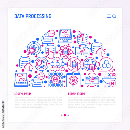 Data processing concept in half circle with thin line icons: data science, filtering, deep learning, mobile syncing, big data, modeling API, cloud database. Modern vector illustration for banner.
