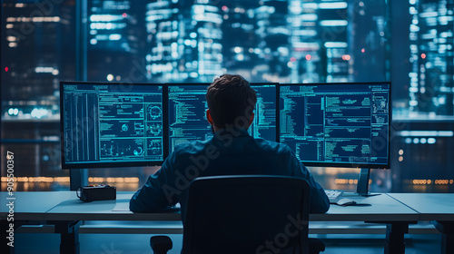 Data Scientist Engrossed in Complex Model Validation Process on Dual-Monitor Setup, Within a Tidy Desk and Subtle Modern Office Ambiance
