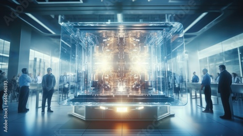Data scientists work in a modern office of a technology company on the development of a quantum computer. Science, technology, big data and blockchain concept.