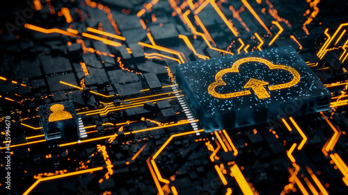 Data storage Technology Concept with cloud upload symbol on a Microchip. Orange Neon Data flows between the CPU and the User across a Futuristic Motherboard. 3D render.