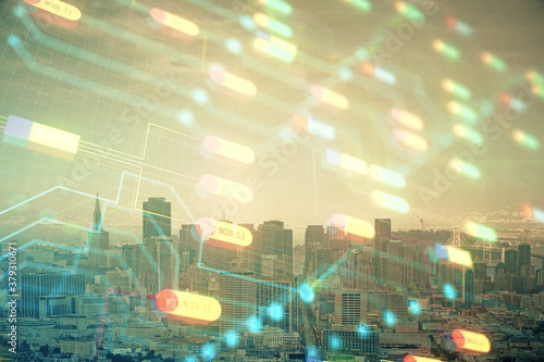 Data theme hologram drawing on city view with skyscrapers background double exposure. Technology concept.