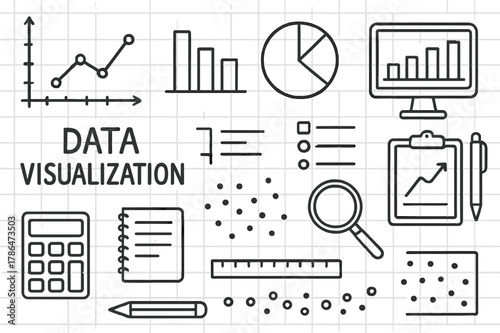 Data Visuals Doodles. Data Visualization. Hand-drawn doodle illustration Data Visualization line graph, bar chart, pie chart, scatter plot, axes, trend line,