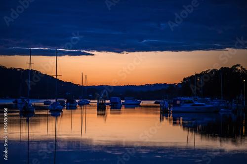 Dawn waterscape with clouds and boats in the channel