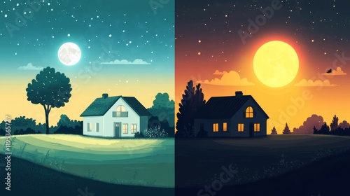 Day and Night Landscape: Peaceful Rural Scene