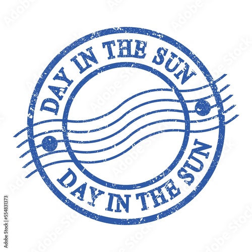 DAY IN THE SUN, text written on blue postal stamp.