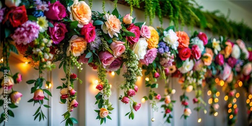 Day of flowers, many bouquets of flowers hang on the wall, roses, peonies, different bright flowers, background