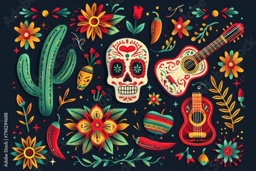 Day of the Dead decorations with a guitar and flowers. Suitable for cultural events or music themes