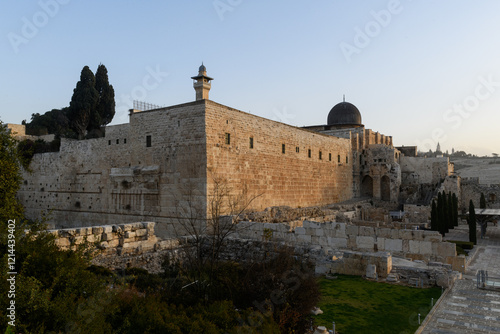 Daylight view of the western and southern walls of the Temple Mount in Jerusalem with a view of the black-domed Al Aqsa mosque and minaret.