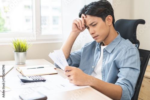 Debt and financial concept, stressed asian young man have a headache while male sitting calculate expenses, income, hand holding bills for prepare payment or pay bills on table at home.