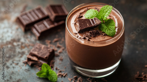 Decadent chocolate mousse with mint garnish served in a glass dish and surrounded by chocolate squares