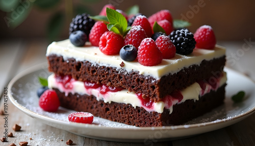 Decadent Chocolate Raspberry Cake with Fresh Berries on Rustic Wooden Surface