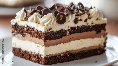 Decadent Close-Up of Chocolate Cake Layered with Cream and Topped with Shaved Chocolate Garnish
